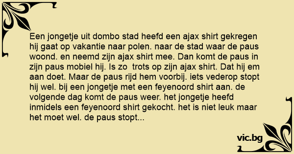 Een jongetje uit dombo stad heefd een ajax shirt gekregen hij gaat op vakantie naar polen. naar de stad waar de paus woond. en neemd zijn ajax shirt mee. Dan komt de paus in zijn paus mobiel hij. Is zo trots op zijn ajax shirt. Dat hij em aan doet. Maar de paus rijd hem voorbij. iets vederop stopt hij wel. bij een jongetje met een feyenoord shirt aan. de volgende dag komt de paus weer. het jongetje heefd inmidels een feyenoord shirt gekocht. het is niet leuk maar het moet wel. de paus stopt dit keer wel. maar zegt had ik niet gezegt dat je op moes rotten.