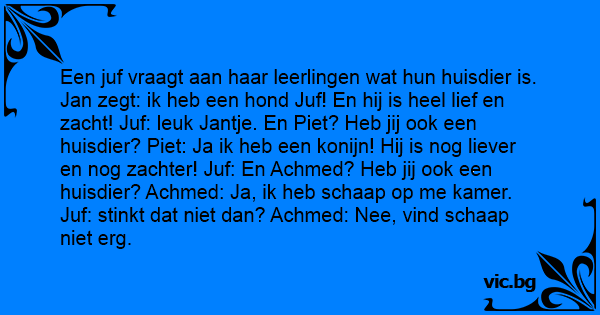 Een juf vraagt aan haar leerlingen wat hun huisdier is. Jan zegt: ik heb een hond Juf! En hij is heel lief en zacht! Juf: leuk Jantje. En Piet? Heb jij ook een huisdier? Piet: Ja ik heb een konijn! Hij is nog liever en nog zachter! Juf: En Achmed? Heb jij ook een huisdier? Achmed: Ja, ik heb schaap op me kamer.