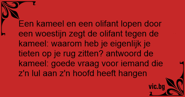 Een kameel en een olifant lopen door een woestijn zegt de olifant tegen de kameel: waarom heb je eigenlijk je tieten op je rug zitten? antwoord de kameel: goede vraag voor iemand die z'n lul aan z'n hoofd heeft hangen