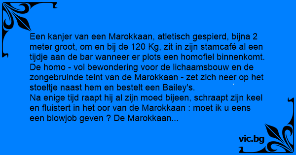 Een kanjer van een Marokkaan, atletisch gespierd, bijna 2 meter groot, om en bij de 120 Kg, zit in zijn stamcafé al een tijdje aan de bar wanneer er plots een homofiel binnenkomt. De hомо - vol bewondering voor de lichaamsbouw en de zongebruinde teint van de Marokkaan - zet zich neer op het stoeltje naast hem en bestelt een Bailey's.