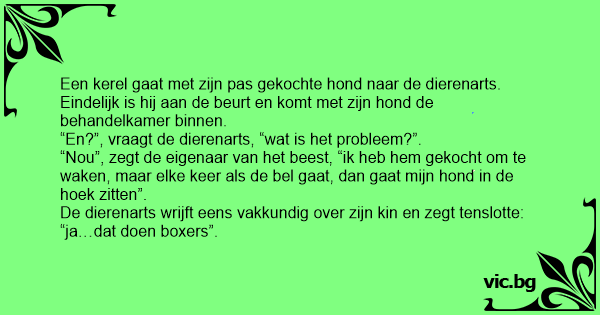 “Nou”, zegt de eigenaar van het beest, “ik heb hem gekocht om te waken, maar elke keer als de bel gaat, dan gaat mijn hond in de hoek zitten”.
