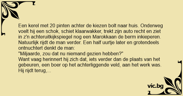 Een kerel met 20 pinten achter de kiezen bolt naar huis. Onderweg voelt hij een schok, schiet klaarwakker, trekt zijn auto recht en ziet in z'n achteruitkijkspiegel nog een Marokkaan de berm inkieperen. Natuurlijk rijdt de man verder. Een half uurtje later en grotendeels ontnuchtert denkt de man:
