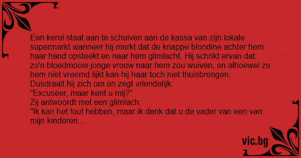 Een kerel staat aan te schuiven aan de kassa van zijn lokale supermarkt wanneer hij merkt dat de knappe blondine achter hem haar hand opsteekt en naar hem glimlacht. Hij schrikt ervan dat zo'n bloedmooie jonge vrouw naar hem zou wuiven, en alhoewel ze hem niet vreemd lijkt kan hij haar toch niet thuisbrengen.