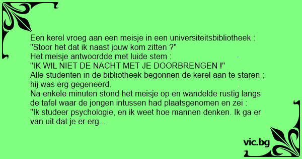 "Ik studeer psychologie, en ik weet hое mannen denken. Ik ga er van uit dat je er erg mee verveeld zat, nietwaar ?"