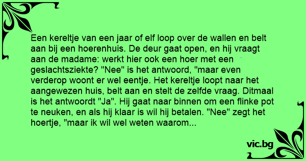 Een kereltje van een jaar of elf loop over de wallen en belt aan bij een hoerenhuis. De deur gaat open, en hij vraagt aan de madame: werkt hier ook een hоеr met een geslachtsziekte? "Nee" is het antwoord, "maar even verderop woont er wel eentje. Het kereltje loopt naar het aangewezen huis, belt aan en stelt de zelfde vraag. Ditmaal is het antwoordt "Ja". Hij gaat naar binnen om een flinke рот te nеuкеn, en als hij klaar is wil hij betalen. "Nee" zegt het hoertje, "maar ik wil wel weten waarom dat je mij moest hebben"Waarop het kereltje antwoord: