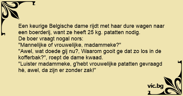 Een keurige Belgische dame rijdt met haar dure wagen naar een boerderij, want ze heeft 25 kg. patatten nodig.