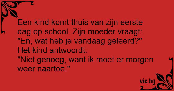Lille Per kom hjem fra sin første skoledag, og hans mor spurgte "Har du lært noget?" - "Ikke det mindste - vi skal komme igen i morgen!"