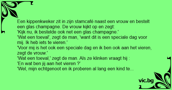 Een kippenkweker zit in zijn stamcafé naast een vrouw en bestelt een glas champagne. De vrouw kijkt op en zegt: