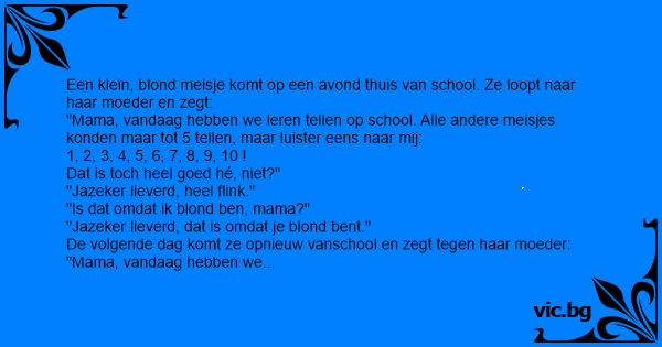 "Mama, vandaag hebben we leren tellen op school. Alle andere meisjes konden maar tot 5 tellen, maar luister eens naar mij: