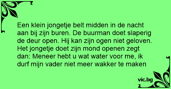 Een klein jongetje belt midden in de nacht aan bij zijn buren. De buurman doet slaperig de deur open. Hij kan zijn ogen niet geloven. Het jongetje doet zijn mond openen zegt dan: Meneer hebt u wat water voor me, ik durf mijn vader niet meer wakker te maken