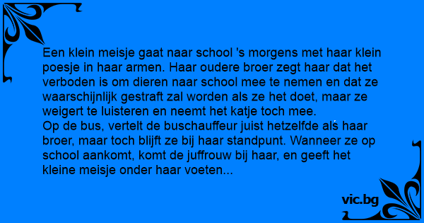 Op de bus, vertelt de buschauffeur juist hetzelfde als haar broer, maar toch blijft ze bij haar standpunt. Wanneer ze op school aankomt, komt de juffrouw bij haar, en geeft het kleine meisje onder haar voeten omdat ze haar huisdier heeft meegenomen en dat dit tegen de regels van het school is, maar toch blijft ze weigeren om katje te laten gaan. De Juf vraagt haar waarom ze zo op haar standpunt blijft en zegt: