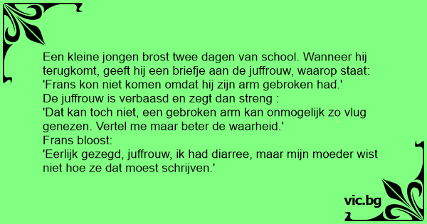 'Eerlijk gezegd, juffrouw, ik had diarree, maar mijn moeder wist niet hое ze dat moest schrijven.'