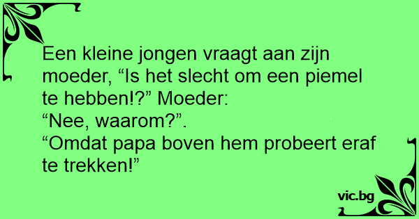 Een kleine jongen vraagt aan zijn moeder, “Is het slecht om een piemel te hebben!?” Moeder: