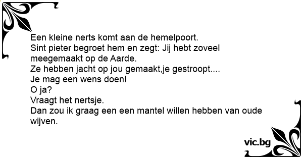 Een kleine nerts komt aan de hemelpoort. Sint pieter begroet hem en zegt: Jij hebt zoveel meegemaakt op de Aarde. Ze hebben jacht op jou gemaakt,je gestroopt.... Je mag een wens doen! O ja? Vraagt het nertsje. Dan zou ik graag een een mantel willen hebben van oude wijven.