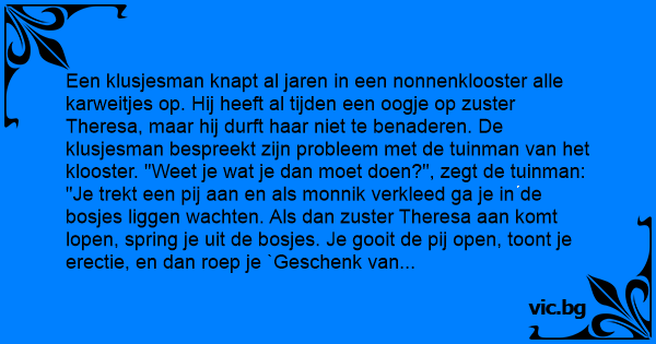 Een klusjesman knapt al jaren in een nonnenklooster alle karweitjes op. Hij heeft al tijden een oogje op zuster Theresa, maar hij durft haar niet te benaderen. De klusjesman bespreekt zijn probleem met de tuinman van het klooster. "Weet je wat je dan moet doen?", zegt de tuinman: