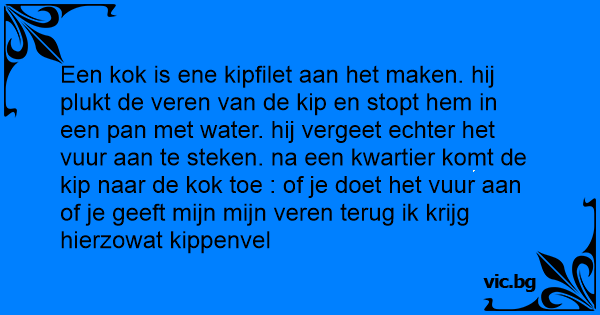Een kok is ene kipfilet aan het maken. hij plukt de veren van de kip en stopt hem in een pan met water. hij vergeet echter het vuur aan te steken. na een kwartier komt de kip naar de kok toe : of je doet het vuur aan of je geeft mijn mijn veren terug ik krijg hierzowat kippenvel