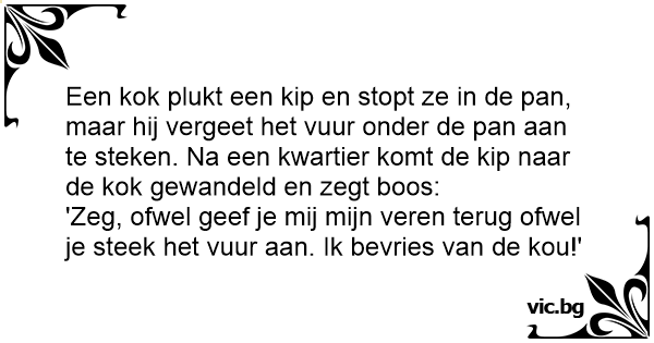 Een kok plukt een kip en stopt ze in de pan, maar hij vergeet het vuur onder de pan aan te steken. Na een kwartier komt de kip naar de kok gewandeld en zegt boos: