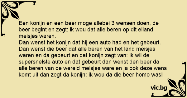 Een konijn en een вееr moge allebei 3 wensen doen, de вееr begint en zegt: ik wou dat alle beren op dit eiland meisjes waren.