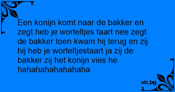 Een konijn komt naar de bakker en zegt heb je worteltjes taart nee zegt de bakker toen kwam hij terug en zij hij heb je worteltjestaart ja zij de bakker zij het konijn vies he hahahahahahahaha