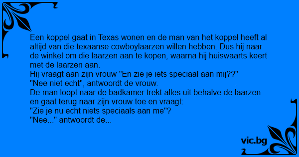 Een koppel gaat in Texas wonen en de man van het koppel heeft al altijd van die texaanse cowboylaarzen willen hebben. Dus hij naar de winkel om die laarzen aan te kopen, waarna hij huiswaarts keert met de laarzen aan.