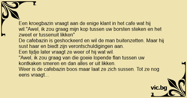 Een kroegbazin vraagt aan de enige klant in het cafe wat hij wil."Awel, ik zou graag mijn кор tussen uw borsten steken en het zweet er tussenuit likken"