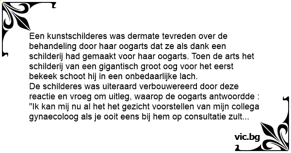 Een kunstschilderes was dermate tevreden over de behandeling door haar oogarts dat ze als dank een schilderij had gemaakt voor haar oogarts. Toen de arts het schilderij van een gigantisch groot oog voor het eerst bekeek schoot hij in een onbedaarlijke lach.