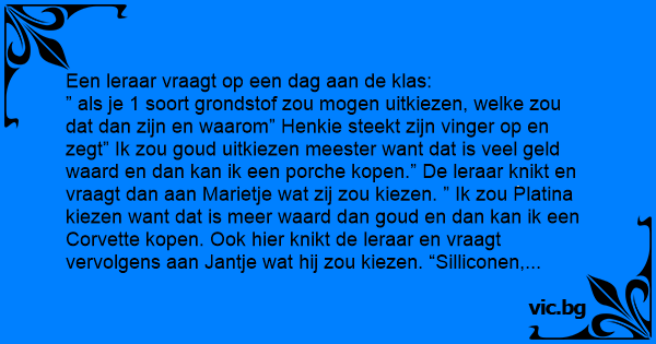 ” als je 1 soort grondstof zou mogen uitkiezen, welke zou dat dan zijn en waarom” Henkie steekt zijn vinger op en zegt” Ik zou goud uitkiezen meester want dat is veel geld waard en dan kan ik een porche kopen.” De leraar knikt en vraagt dan aan Marietje wat zij zou kiezen. ” Ik zou Platina kiezen want dat is meer waard dan goud en dan kan ik een Corvette kopen. Ook hier knikt de leraar en vraagt vervolgens aan Jantje wat hij zou kiezen. “Silliconen, meester” Zegt Jantje. “Silliconen?” Vraagt de meester: