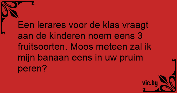 Een lerares voor de klas vraagt aan de kinderen noem eens 3 fruitsoorten. Moos meteen zal ik mijn banaan eens in uw pruim peren?