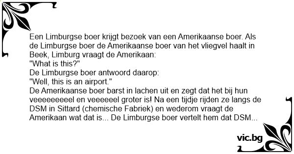 De Amerikaanse boer barst in lachen uit en zegt dat het bij hun veeeeeeeeel en veeeeeel groter is! Na een tijdje rijden ze langs de DSM in Sittard (chemische Fabriek) en wederom vraagt de Amerikaan wat dat is... De Limburgse boer vertelt hem dat DSM een Chemische fabriek is, waarop de Amerikaan weer op zijn beurt keihard begint te lachen en zegt dat het bij hun veeeeeeel en veeeeeeeel groter is!! De Limburgse boer begint zich nu flink te irriteren aan het opschepperige gedrag van de Amerikaan, maar zwijgt er verder over... Hij denkt: