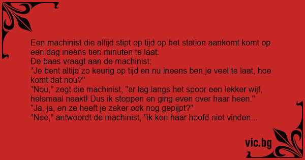 "Nou," zegt die machinist, "er lag langs het spoor een lekker wijf, helemaal naakt! Dus ik stoppen en ging even over haar heen."