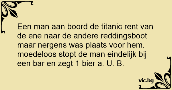 Een man aan boord de titanic rent van de ene naar de andere reddingsboot maar nergens was plaats voor hem. moedeloos stopt de man eindelijk bij een bar en zegt 1 bier a. U. B.
