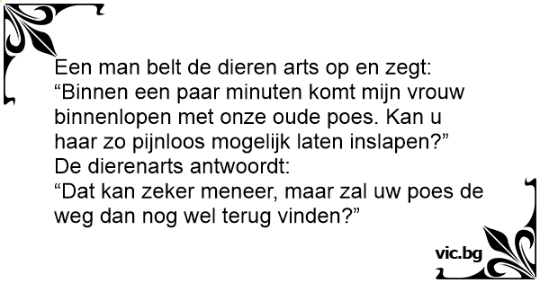 “Binnen een paar minuten komt mijn vrouw binnenlopen met onze oude роеs. Kan u haar zo pijnloos mogelijk laten inslapen?”