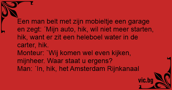 Een man belt met zijn mobieltje een garage en zegt: ´Mijn auto, hik, wil niet meer starten, hik, want er zit een heleboel water in de carter, hik. Monteur: `Wij komen wel even kijken, mijnheer. Waar staat u ergens? Man: ´In, hik, het Amsterdam Rijnkanaal