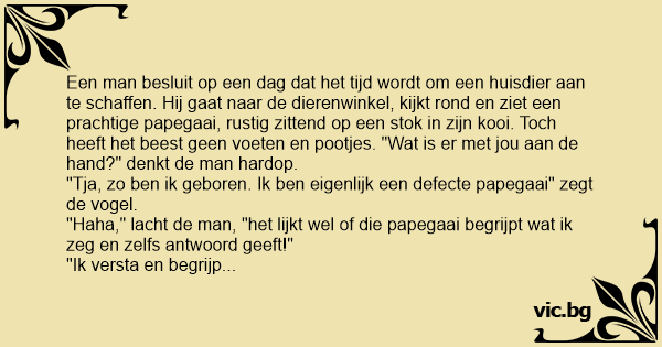 Een man besluit op een dag dat het tijd wordt om een huisdier aan te schaffen. Hij gaat naar de dierenwinkel, kijkt rond en ziet een prachtige papegaai, rustig zittend op een stok in zijn kooi. Toch heeft het beest geen voeten en pootjes. "Wat is er met jou aan de hand?" denkt de man hardop.