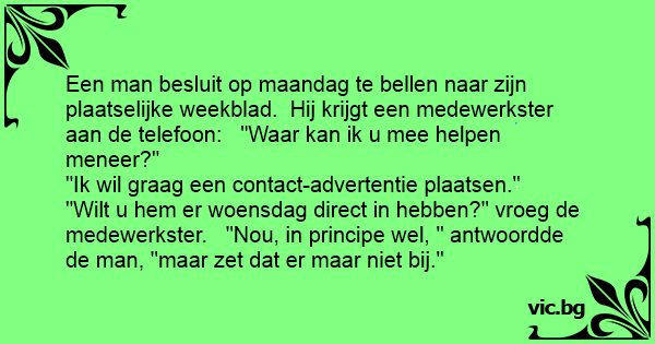 Een man besluit op maandag te bellen naar zijn plaatselijke weekblad. Hij krijgt een medewerkster aan de telefoon: "Waar kan ik u mee helpen meneer?"