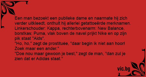 Een man bezoekt een publieke dame en naarmate hij zich verder uitkleedt, onthult hij allerlei getattoeërde merknamen. Linkerschouder: Kappa, rechterbovenarm: New Balance, borstkas: Puma, vlak boven de navel prijkt Nike en op zijn pik staat "Aids".