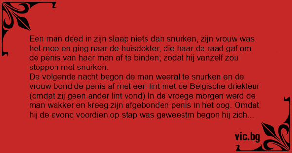 De volgende nacht begon de man weeral te snurken en de vrouw bond de реnis af met een lint met de Belgische driekleur (omdat zij geen ander lint vond) In de vroege morgen werd de man wakker en kreeg zijn afgebonden реnis in het oog. Omdat hij de avond voordien op stap was geweestm begon hij zich vragen te stellen en mompelde in zichzelf: