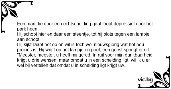Hij kijkt raapt het op en wil is toch wel nieuwsgierig wat het nou precies is. Hij wrijft op het lampje en poef, een geest springt er uit. "Meester, meester, u heeft mij gered. In ruil voor mijn dankbaarheid krijgt u drie wensen, maar omdat u in een scheiding ligt, wil ik u er wel bij vertellen dat omdat u in scheiding ligt krijgt uw vrouw het dubbele."