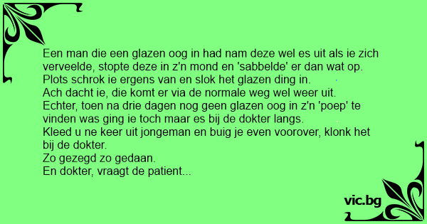 Een man die een glazen oog in had nam deze wel es uit als ie zich verveelde, stopte deze in z'n mond en 'sabbelde' er dan wat op. Plots schrok ie ergens van en slok het glazen ding in. Ach dacht ie, die komt er via de normale weg wel weer uit. Echter, toen na drie dagen nog geen glazen oog in z'n 'роер' te vinden was ging ie toch maar es bij de dokter langs. Kleed u ne keer uit jongeman en buig je even voorover, klonk het bij de dokter. Zo gezegd zo gedaan. En dokter, vraagt de patient dan, zie ge nie zitten? Niks zegt de dokter, ik zie nog helemaal niks. Da's straf antwoord de patient, ik zie u daar toch wel staan hооr!