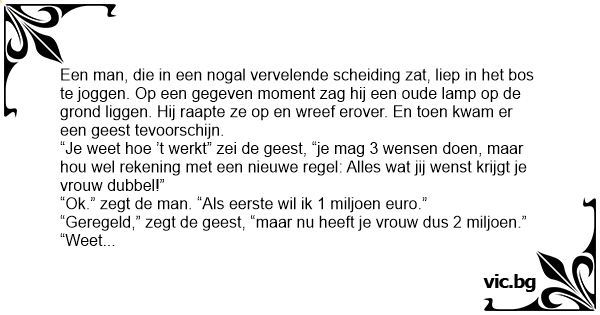 “Je weet hое ’t werkt” zei de geest, “je mag 3 wensen doen, maar hou wel rekening met een nieuwe regel: Alles wat jij wenst krijgt je vrouw dubbel!”