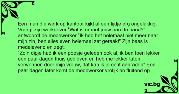 “Zo’n dipje had ik een poosje geleden ook al, ik ben toen lekker een paar dagen thuis gebleven en heb me lekker laten verwennen door mijn vrouw, dat kan ik je echt aanraden” Een paar dagen later komt de medewerker vrolijk en fluitend op zijn werk. Vraagt de werkgever “Je веnт alweer wat vrolijker zie ik?”