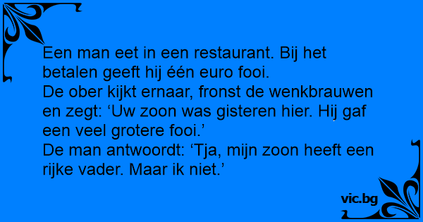 De ober kijkt ernaar, fronst de wenkbrauwen en zegt: ‘Uw zoon was gisteren hier. Hij gaf een veel grotere fooi.’