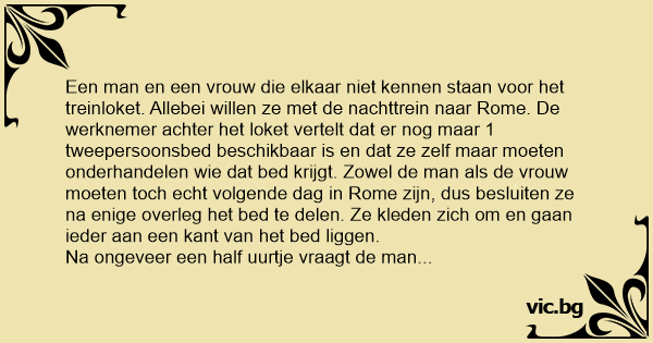 Na ongeveer een half uurtje vraagt de man "Kan je wel in slaap komen?" waarop de vrouw antwoordt dat ze het een beetje koud vind. Daar kunnen we maar 2 dingen aan doen, zegt de man. Of ik ga voor jou een deken halen, of we doen alsof we gehuwd zijn. Nou, zegt de vrouw na enig tijd nadenken, laten we dan maar doen alsof we gehuwd zijn.