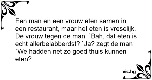 Een man en een vrouw eten samen in een restaurant, maar het eten is vreselijk. De vrouw tegen de man: `Bah, dat eten is echt allerbelabberdst? `Ja? zegt de man `We hadden net zo goed thuis kunnen eten?