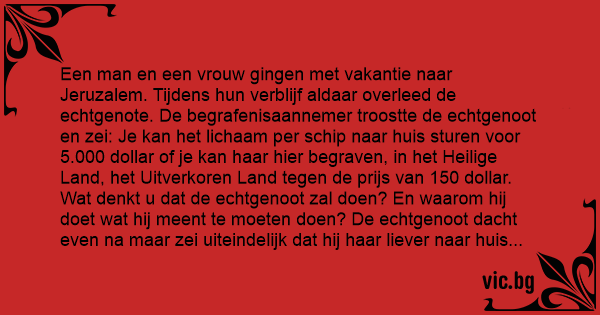 Een man en een vrouw gingen met vakantie naar Jeruzalem. Tijdens hun verblijf aldaar overleed de echtgenote. De begrafenisaannemer troostte de echtgenoot en zei: Je kan het lichaam per schip naar huis sturen voor 5.000 dollar of je kan haar hier begraven, in het Heilige Land, het Uitverkoren Land tegen de prijs van 150 dollar. Wat denkt u dat de echtgenoot zal doen? En waarom hij doet wat hij meent te moeten doen? De echtgenoot dacht even na maar zei uiteindelijk dat hij haar liever naar huis wou verschepen. Waarom toch, zei de begrafenisaannemer die niet begreep waarom de man zoveel geld wilde betalen. Waarom wil je 5.000 dollar uitgeven om haar per boot mee te nemen naar huis , terwijl het voor u toch heerlijk moet zijn te weten dat ze hier in het Beloofde Heilige Land kan begraven worden voor slechts 150 dollar? De man antwoordde op de koele, ernstige toon die hem al die jaren had getypeerd. Lang geleden, zei de man, stierf hier een man, werd hier ook begraven en drie dagen later verrees hij. Ik kan dat risico niet nemen.
