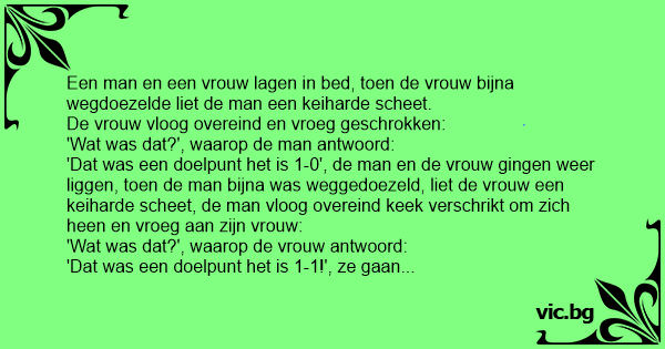 'Dat was een doelpunt het is 1-1!', ze gaan beide weer liggen, de man piekerde en piekerde, en dacht bij zichzelf, dit kan ik kan toch niet verliezen van mijn eigen vrouw, waarop hij probeert een keiharde scheet te laten, dat lukte hem ook wel aardig maar er kwam een vloed van sтrоnт mee, waarop de vrouw weer wakker wordt, en zegt: