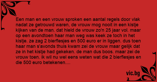 Een man en een vrouw sproken een aantal regels door vlak nadat ze getrouwd waren, de vrouw mog nooit in een kistje kijken van de man. dat hield de vrouw zo'n 25 jaar vol. maar op een avondtoen haar man weg was keek ze toch in het kistje. ze zag 2 bierflesjes en 500 euro er in liggen. dus toen haar man s'avonds thuis kwam zei de vrouw maar gelijk dat ze in het kistje had gekeken. de man dus boos. maar zei de vrouw toen. ik wil nu wel eens weten wat die 2 bierflesjes en die 500 euro betekenen. nou zei de man, elke keer als ik vreemd ga, zuip ik een bierflesje leeg. nou.. dus 2 keer vreemd gegaan, gaat nog wel zegt de vrouw. maar wat betekent die 500 euro dan?