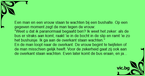 "Weet u dat ik paranormaal begaafd ben? Ik weet het zeker: als de bus er straks aan komt, raakt ’ie in de bocht in de slip en ramt ’ie zo het bushuisje. Ik ga aan de overkant staan wachten."