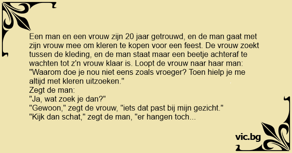 Een man en een vrouw zijn 20 jaar getrouwd, en de man gaat met zijn vrouw mee om kleren te kopen voor een feest. De vrouw zoekt tussen de kleding, en de man staat maar een beetje achteraf te wachten tot z'n vrouw klaar is. Loopt de vrouw naar haar man: "Waarom doe je nou niet eens zoals vroeger? Toen hielp je me altijd met kleren uitzoeken." Zegt de man: "Ja, wat zoek je dan?" "Gewoon," zegt de vrouw, "iets dat past bij mijn gezicht." "Kijk dan schat," zegt de man, "er hangen toch plooirokken?"