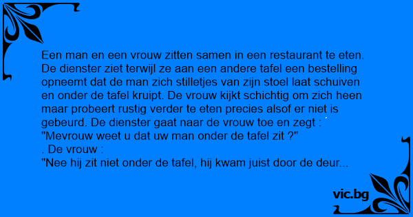 "Mevrouw weet u dat uw man onder de tafel zit ?"